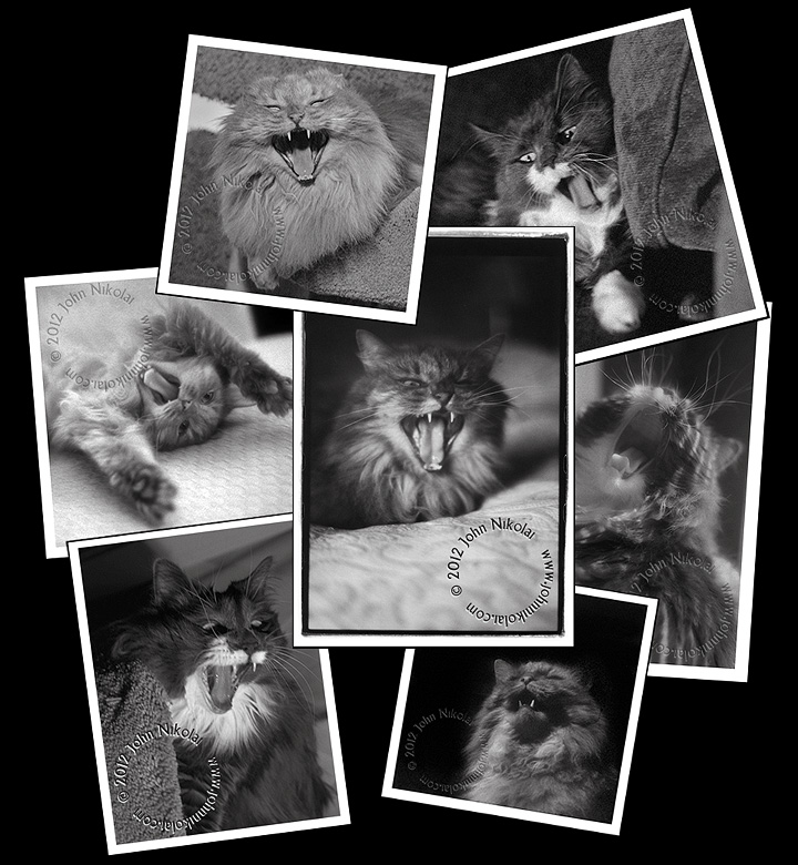 ANOTHER SHOT OF OUZO WITH BELA LUGOSI (the yawning cat series) Two of the biggest blessings I have been graced with in this lifetime walk on four legs each. They are my feline children, Bela Lugosi (the black and white cat pictured below) and Ouzo (in the gray fur coat). Bela is the sweetest, most gentle creature I have ever known. Ouzo is proud, dignified and dashing - a real lady-killer. At one of his birthday parties he was surrounded by half a dozen beautiful models who were fawning over him and one male guest at the party enviously commented, "Ouzo has a harem." As I write these words at the end of 2012, Bela is now 13 and Ouzo, who has just turned 14, is one-third of my age! I have been photographing them yawning since they were babies and, even if I just make one copy of it for myself, plan to make a book of photos titled "Another Shot of Ouzo With Bela Lugosi," a collection of my favorite images from the series. |